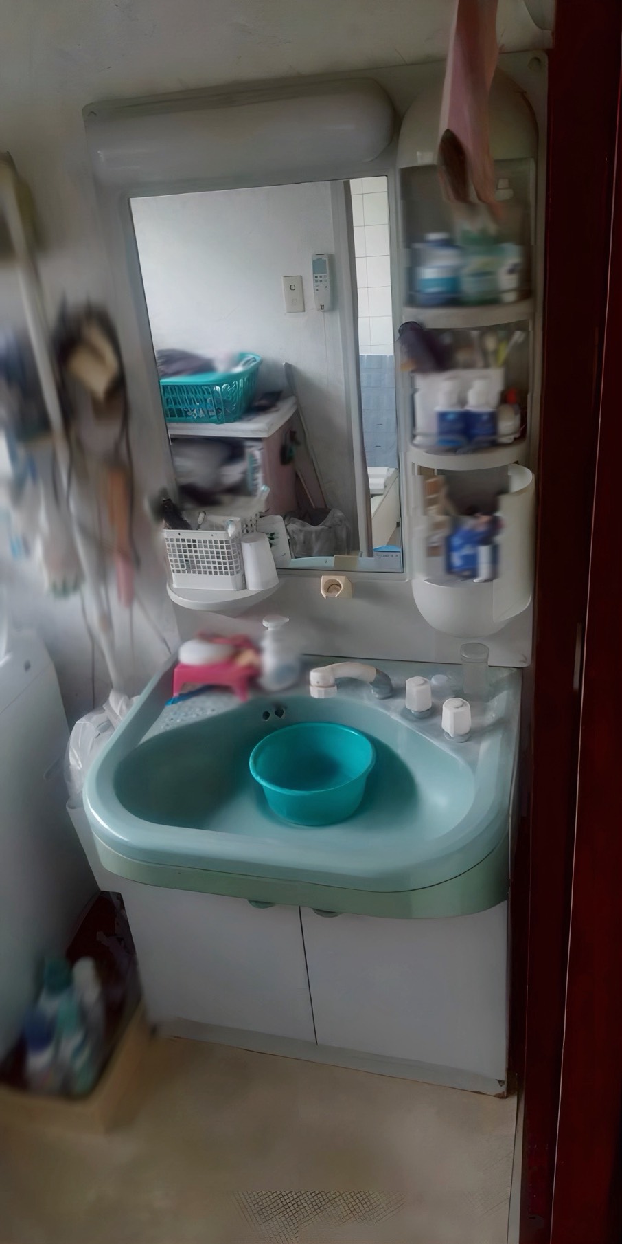 三面鏡を開くと高さが自由に調整できるトレイがあり、 底が深い洗面ボウルで洗顔もしやすいです! |