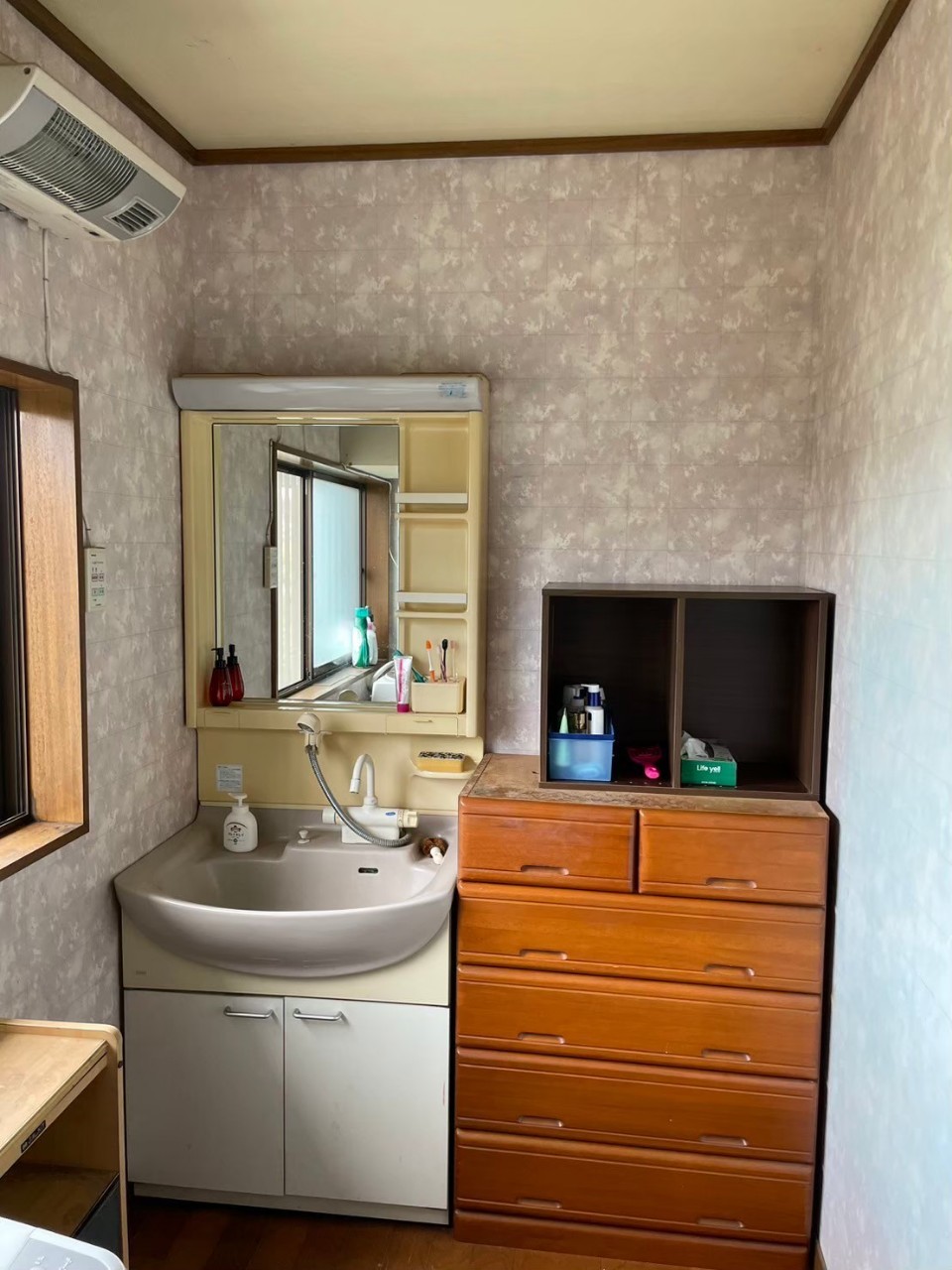 壁と同系色の木目調の洗面台でおしゃれに変身! |